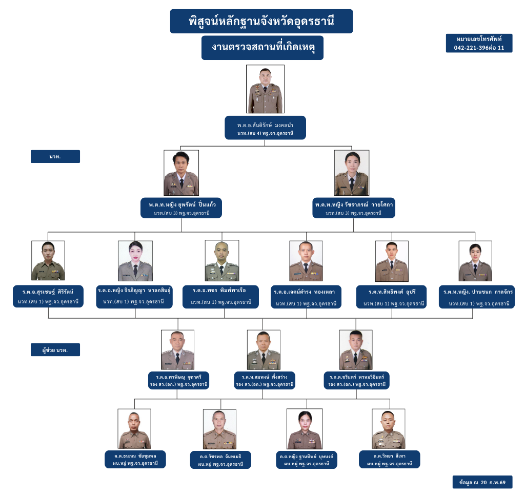 งานตรวจสถานที่เกิดเหตุ มีหน้าที่และความรับผิดชอบเกี่ยวกับงานตรวจสถานที่เกิดเหตุในคดีต่าง ๆ งานถ่ายภาพ เพื่อสนับสนุนพนักงานสอบสวนในเขตพื้นที่ความรับผิดชอบของ พิสูจน์หลักฐานจังหวัดอุดรธานี โดยปฏิบัติหน้าที่ ดังนี้